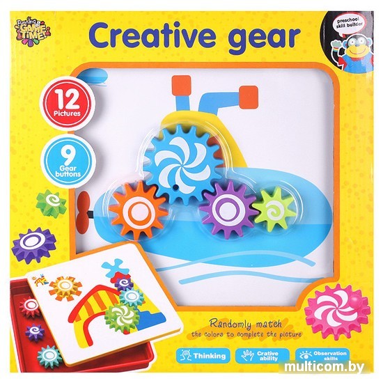 | Комплектация | 12 картинок (трафаретов), 9 разноцветных шестеренок с фиксаторами, 3 ручки для вращения шестеренок, доска для фиксации и контейнер для хранения |