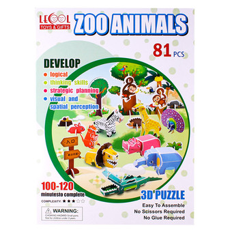 | Информация | Пазл 3D "Zoo Animals" LK-8861 . Игрушка включает в себя 4 листа пенокартона с вырубленными элементами, из которых необходимо собрать представленные на картинке фигурки. Упаковка - картонная коробка 22*30*1,2см. |