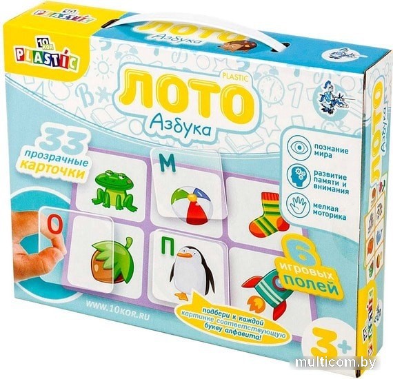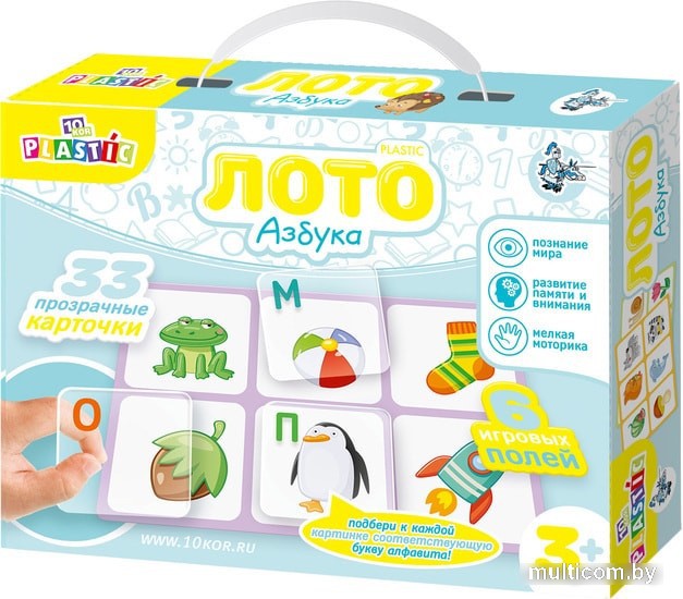 | Информация | Учите с малышом азбуку в игровой форме, сопоставляя красочные картинки с буквами!Игровые поля раздаются всем участникам игры или выкладываются на стол перед единственным игроком. На каждом игровом поле содержится 6 ячеек с объектами, к которым необходимо правильно подобрать прозрачные карточки с буквами.Старшие могут поучаствовать в игре в качестве ведущего.Ведущий перемешивает все прозрачные карточки, а затем вытаскивает по одной и называет букву, изображённую на ней. Игроки ищут на своих карточках объекты, названия которых начинаются с этой буквы.Тот, кто быстрее всех обнаружил такую картинку на своей карточке, получает прозрачную карточку с буквой себе и закрывает ею нужную ячейку.При игре с одним ребёнком просите малыша подбирать прозрачные карточки к нужным ячейкам и объяснять свой выбор. Таким образом вы не только выучите азбуку с ребёнком, но и научите его объяснять логику своих решений.Детское лото «Азбука» развивает память, внимание, мелкую моторику рук, помогает освоить русский алфавит. |