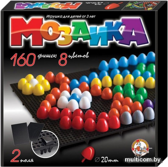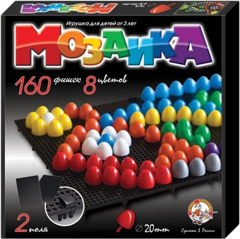 | Комплектация | Количество мозаик - 160 штКоличество цветов - 8Поле (плата) 280х280х40 мм - 2 штФишки для соединения полей - 3 шт |
