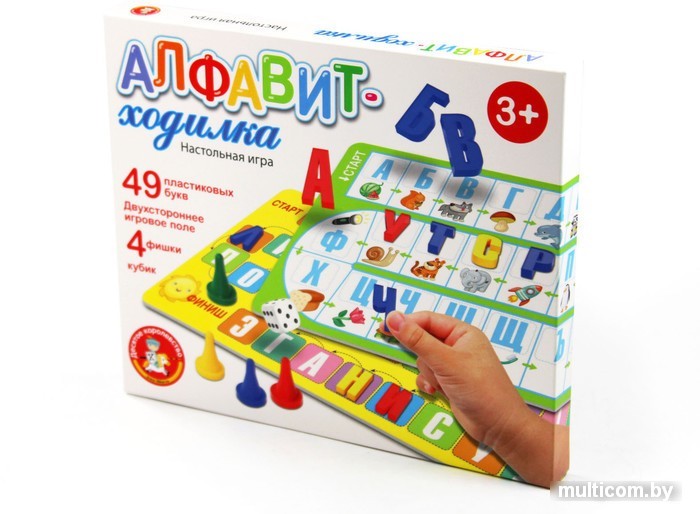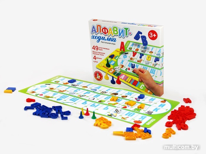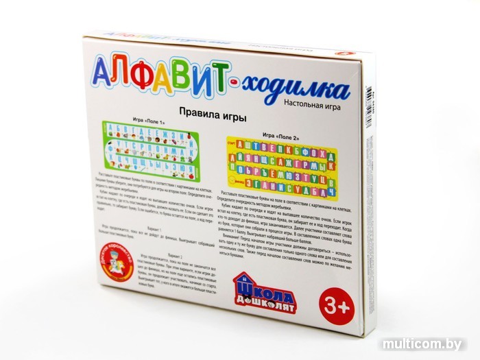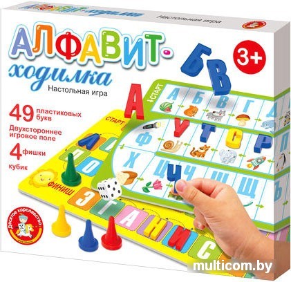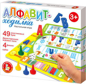 | Информация | Учите буквы весело и с удовольствием с настольной игрой «Алфавит-ходилка»! Состав: • пластиковые буквы без магнитов – 49 шт. (высота 2,5 см) желтого, синего и красного цветов • двустороннее игровое поле – 1 шт. (47х20,5 см) • игровые фишки – 4 шт. • кубик – 1 шт. (1,5х1,5 см.) Игра предназначена для детей от 5 лет. Количество игроков: от 2 до 5. Как играть? Игра «Поле 1» Расставьте пластиковые буквы по полю в соответствии с картинками на клетках. Лишние буквы уберите, они потребуются для игры на втором поле. Определите очередность методом жеребьевки. Кубик кидают по очереди и ходят на выпавшее количество очков. Если игрок встал на клетку, где есть пластиковая буква, он должен назвать ее. Если он сделает это правильно, то он забирает букву. Если ошибется, то буква остается на поле, а ход переходит к другому игроку. Вариант 1 Игра продолжается, пока все не дойдут до финиша. Выигрывает собравший больше пластиковых букв. Вариант 2 Игра продолжается, пока на поле не закончатся все пластиковые буквы. При этом варианте, если игрок дошел до финиша, но на поле еще остались пластиковые буквы, он продолжает участвовать, начиная со старта. Выигрывает тот, у кого в итоге окажется больше пластиковых букв. Игра «Поле 2» Расставьте пластиковые буквы по полю в соответствии с картинками на клетках. Определите очередность методом жеребьевки. Кубик кидают по очереди и ходят на выпавшее количество очков. Если игрок встал на клетку, где есть пластиковая буква, он забирает ее и ход переходит. Когда кто-то доходит до финиша, игра заканчивается. Далее участники составляют слова из букв, которые они собрали в процессе игры. В составленных словах одна буква равняется 1 баллу. Выигрывает набравший больше баллов. Внимание! Перед началом игры участники должны договориться – использовать одну и ту же букву для составления только одного слова или для составления нескольких слов. Также перед началом составления слов можно по желанию меняться буквами. Игра служит отличным тренажером для изучения букв русского алфавита и может использоваться в качестве вспомогательного пособия для обучения детей чтению. Больше детских обучающих игр смотрите в разделе «Настольные игры». |