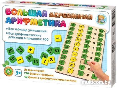 | Комплектация | деревянное игровое поле – 1 шт. (30 х 20 см) деревянные фишки с цифрами и числами (зеленого цвета) – 210 шт. (22 х 22 х 3 мм) деревянные фишки с арифметическими знаками (желтого цвета) – 40 шт. (22 х 22 х 3 мм) |
