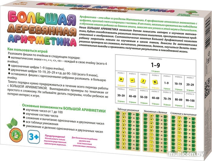 | Информация | Познакомьте вашего ребенка с числами от 1 до 100 и простыми математическими операциями (сложение, вычитание, умножение и деление) с помощью настольной игры-пазла «Большая деревянная Арифметика»! Прививайте малышу интерес к изучению математики с самого детства – это позволит ему развить логическое мышление, память и воображение, научит делать самостоятельные выводы и применять полученные результаты в повседневной жизни. Состав игры: • деревянное игровое поле – 1 шт. (30 х 20 см) • деревянные фишки с цифрами и числами (зеленого цвета) – 210 шт. (22 х 22 х 3 мм) • деревянные фишки с арифметическими знаками (желтого цвета) – 40 шт. (22 х 22 х 3 мм) Игра предназначена для детей от 3 лет. Как играть? Разложите фишки в следующем порядке: математические знаки «+», «-», «:», «х» – каждый в свою ячейку (всего 4 ячейки); однозначные числа 1–9 (одна ячейка); двузначные числа 10–19, 20–29 и т.д. до 90–100 (всего 9 ячеек); оставшиеся фишки с однозначными числами положите в большую ячейку. Такого порядка работы нужно придерживаться в течение всего периода занятий с Большой Арифметикой. Выкладывайте примеры по тематикам от простого к сложному и не забывайте делать перерывы, чтобы ребенок не потерял интерес к игре. Игра изготовлена из березовой фанеры. Фишки тщательно отшлифованы и имеют скругленные углы во избежание получения заноз и других травм во время игры. Картинки нанесены на поверхность фанеры с помощью техники прямой печати, что позволяет изображениям дольше сохранять яркость. Настольная игра «Большая деревянная Арифметика» формирует начальные представления о простых арифметических операциях, развивает логику и память, прививает интерес к такой важной науке, как математика. Посмотрите весь ассортимент развивающих игр в категории «Настольные игры» на нашем сайте. |
