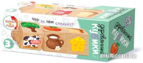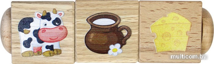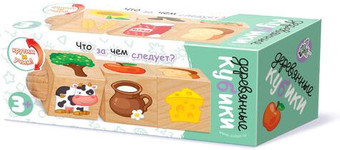 | Информация | Тренируйте мелкую моторику, развивайте логику и мышление вместе с Кубиками деревянными на оси «Что за чем следует» (3 кубика). Поворачивая кубики, ребенок потренирует мелкую моторику рук и научится составлять логические цепочки. Состав игры: • кубики деревянные на оси – 3 шт. (размер грани кубика 4 см) Общий размер игрушки 14 х 4 см Размеры кубиков – 14 х 4 х 4 см Вес игрушки – 144 г Игра предназначена для детей от 3 лет. Деревянные кубики на оси «Что за чем следует» для детей от 3-х лет изготавливаются из экологического материала – массива дерева. Изображения наносятся на кубик с применением технологии прямой печати, что обеспечивает износостойкость игрушки. Как играть? Игрушка состоит из 3-х вращающихся кубиков на оси. Вращая кубик, ребенок должен подобрать такую комбинацию, когда изображение на 2 кубике показывает, что можно получить из предмета, изображенного на 1 кубике, а предмет на кубике 3 является следствием переработки предмета (вещества) с кубика 2. Например, на 1 кубике изображена яблоня, значит надо подобрать на 2 кубике яблоко, так как оно растет на яблоне. А на кубике 3 нужно подобрать варенье, так как оно делается из яблок, и т.п. Кубики деревянные на оси «Что за чем следует» (3 кубика) направлены на развитие логики и образного мышления малышей. Поворачивая кубики, ребенок тренирует мелкую моторику рук и учится составлять логические цепочки. Тренируйте логическое мышление малыша с другими кубиками серии «Деревянные кубики для детей» от «Десятого королевства». |