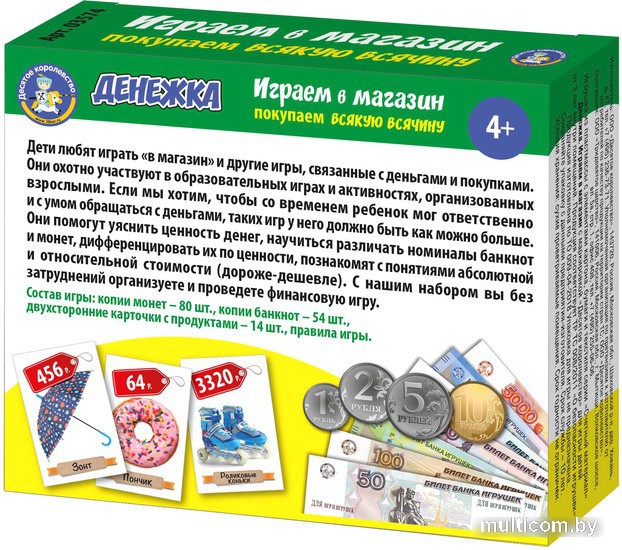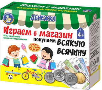 | Информация | Устройте с ребенком увлекательную игру в магазин! Покупайте и продавайте различные предметы одежды, еду, игрушки и многое другое, примеряя на себя роли покупателя и продавца в увлекательной игре «Денежка. Играем в магазин»! Состав игры: • монеты – 80 шт. (диаметр от 21 до 25 мм) • копии банкнот – 54 шт. • двусторонние карточки с объектами – 14 шт. (55 х 85 мм) • правила игры Игра предназначена для детей от 4 до 6 лет. Пластмассовые монеты и бумажные банкноты являются игровыми копиями реальных денег Российской Федерации, благодаря чему в процессе игры ребенок научится обращаться с настоящими деньгами и не попадет в неудобную ситуацию, самостоятельно совершая покупки в магазине. Как играть? Набор предлагает несколько вариантов игры, благодаря которым ребенок сможет ощутить себя как на стороне покупателя, так и на стороне продавца. Вариант 1. Купи. Разложите перед ребенком карточки с изображением одежды и обуви и попросите его купить все – начиная с самых дешевых и заканчивая самыми дорогими. Малышу потребуется самостоятельно подобрать нужное количество купюр и монеток и оплатить покупку без сдачи. Вариант 2. Продай. Разделите все деньги на 2 части таким образом, чтобы большая часть оказалась у ребенка. Разложите на столе карточки товаров. В данной игре ребенку предстоит выполнять функцию продавца: покупайте у него товары, давая сумму, превышающую стоимость товара, чтобы ребенок выдавал вам сдачу. Подробные правила игры с перечислением всех вариантов смотрите в разделе «Поддержка» на нашем сайте (или нажмите на оранжевую иконку правил справа в карточке товара). Настольная игра «Денежка. Играем в магазин» в увлекательной форме научит ребенка считать в уме, быстро отделять нужное количество монет и купюр для оплаты товара на кассе и определять, правильно ли продавец выдал сдачу. Игра тренирует логическое мышление, внимательность и скорость реакции. Другие развивающие игры для детей смотрите в категории «Настольные игры» на нашем сайте. |