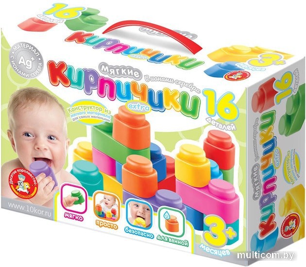 | Информация | Антибактериальные мягкие кирпичики с ионами серебра – лучший первый конструктор, который вы можете подарить своему крохе. Малыш будет счастлив играть с красочной увлекательной игрушкой, а родители могут быть абсолютно спокойны за своего ребёнка, ведь материал набора полностью безопасен, даже если малышу захочется попробовать детали на вкус!Состав набора:- одинарный элемент – 9 шт. (ДШВ: 5 х 5 х 5 см)- двойной элемент – 5 шт. (ДШВ: 10 х 5 х 5 см)- тройной элемент – 2 шт. (ДШВ: 15 х 5 х 5 см)Этот красочный и мягкий конструктор предназначен специально для самых маленьких детей возрастом от 3 месяцев.Все элементы игрушки выполнены из безопасного для ребёнка материала нового поколения со специальной антимикробной добавкой. Благодаря ионам серебра, материал конструктора обладает антибактериальным эффектом и обеспечит вашему малышу максимально безопасную игру на длительное время (более 5 лет), даже если захочется попробовать кирпичик на вкус. |