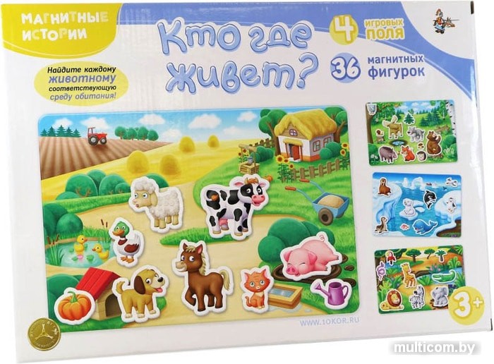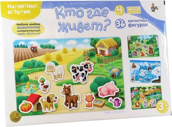 | Комплектация | - 4 красочных игровых поля 31х21 см с разными средами обитания: джунгли, ферма, полярная зона, лес.- 36 крупных красочных магнитных фигурок и предметов.- Магнитная доска, размером 35х25,5 см. |