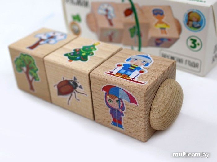 | Информация | Деревянные кубики на оси «Времена года» для детей от 3-х лет изготавливаются из экологического материала – массива дерева. Изображения наносятся на кубик с применением технологии прямой печати, что обеспечивает износостойкость игрушки. Игрушка состоит из 3-х вращающихся кубиков на оси. Кубики на оси направлены на развитие логики и образного мышления малышей. Поворачивая кубики, ребенок тренирует мелкую моторику рук и знакомится с временами года и сезонными особенностями. |