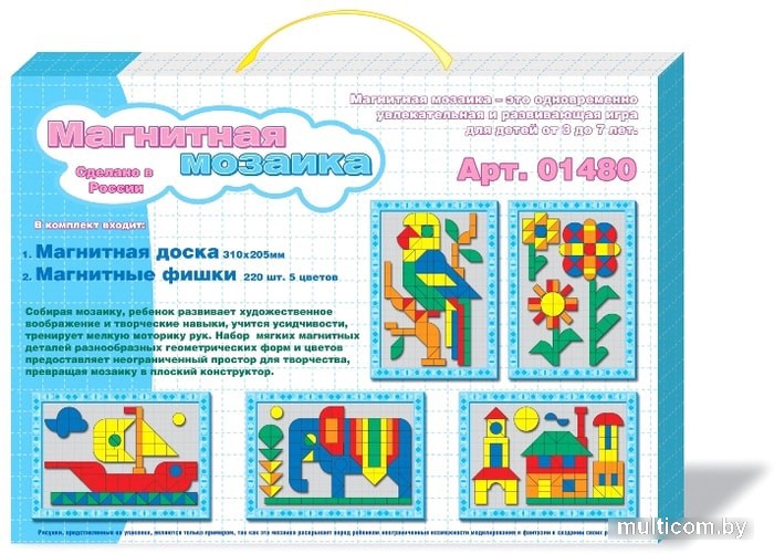 | Комплектация | - элементы различной геометрической формы на магнитной основе, 4 цвета (желтый, красный, синий, зеленый, светло-коричневый) - 220 шт;- магнитная доска , 310х205 мм с разметкой поля - 1 шт. |