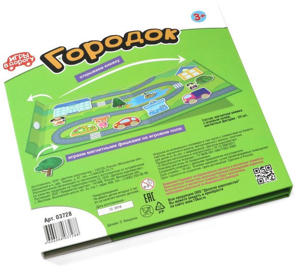 | Информация | Развивающая магнитная игра «Городок» предназначена для детей от 3-х лет и входит в серию «Игры в дорогу». Возьмите компактную книжку с собой в поездку, чтобы занять малыша в пути! Состав игры: • Магнитная книжка с игровым полем (19,5х19,5х2 см) • Магнитные фигурки – 25 шт. (размеры от 3х3 до 9х7 см) Книжка разворачивается в магнитное поле с картой, на которой ребенок может построить свой город. В распоряжении малыша – детский садик, магазин игрушек, горожане, животные, автомобили и другие атрибуты городской жизни. Игра развивает логическое и образное мышление и тренирует мелкую моторику рук ребенка. Посмотрите игры серии «Игры в дорогу» от «Десятого королевства»: «Судоку 5+», «Судоку 8+», «Я рисую!». |