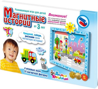 | Информация | Дополнительный набор «Магнитные истории» отличается от основной игры отсутствием магнитной доски. Рекомендуем его для покупки в том случае, если у вас уже имеется какая-либо игра «Десятого королевства» с магнитным планшетом.Выберите картинку, закрепите ее на поле с помощью магнитных уголков и помогите малышу подобрать соответствующие выбранному фону фигурки. Благодаря магнитной основе фигурки хорошо держатся на поле.Расставляя фигурки и создавая свою магнитную историю, ребенок интересно проведет время со своими новыми друзьями - на даче, на море, в городе и на ферме. Научится понимать - кто где живет, когда идет дождь, а когда светит солнце, и как вести себя в городе, а светофор подскажет ему (с Вашей помощью), как правильно переходить дорогу. Окружающий нас мир многогранен и разнообразен и, надеемся, что наши «Магнитные истории» помогут малышу, хотя бы частично, познакомиться с ним! |