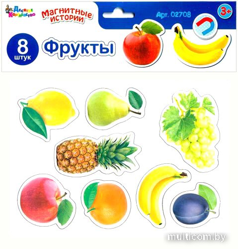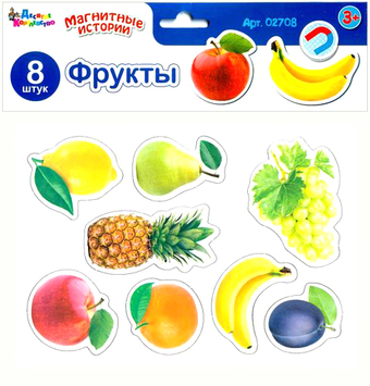 | Информация | Магниты «Фрукты» входят в серию игр магнитные истории. В эту игру входят 8 мягких магнитных элементов – слива, банан, апельсин, яблоко, ананас, виноград, груша и лимон. Для игры можно использовать поля от любой магнитной истории и магнитных мозаик «Десятого королевства» или просто поверхность холодильника. Магниты «Фрукты» рекомендуется детям от 3 до 5 лет. Подключитесь к игре, пусть малыш покажет какие фрукты он уже знает, назовет их, расскажет, как они растут и какие на вкус, поправьте ребенка, если он ошибется. Отдельно расскажите о незнакомых ему фруктах, попросите, чтобы он повторил ваш рассказ. Игру можно сделать еще интереснее, если к ней купить магниты «Ягоды» и «Овощи», которые также входят в серию магнитные истории. |