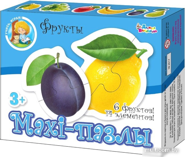 | Комплектация | 6 контурных пазлов (виноград, лимон, яблоко, бананы, слива и груша). Четыре из них состоят из 2 частей, а два из 3 частей. Всего 14 элементов. |
