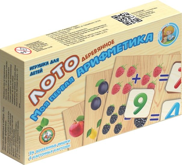 | Информация | Деревянное лото «Моя первая арифметика» в игровой форме познакомит ребёнка с цифрами и основными математическими знаками, а также научит решать простейшие примеры на два первых математических действия – сложение и вычитание.Как играть?Играть в лото можно как индивидуально, так и компанией до 6 человек.Для индивидуальных занятий раскладываются все картинки с примерами, а свободные окна заполняются цифрами.Если играть компанией, то раздаются карточки с примерами. На столе раскладываются фишки цифрами вниз. Ведущий по очереди открывает фишку с цифрой. Чтобы понять, подходит ли игроку данная фишка, он должен решить пример на карточке или для начала, чтобы было легче, пересчитать изображённые ягоды.Игрок, который раньше остальных закрыл все свободные окна на карточке, а значит, и решил все примеры на карточке правильно, выигрывает и получает звание «Юный математик». |