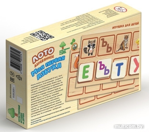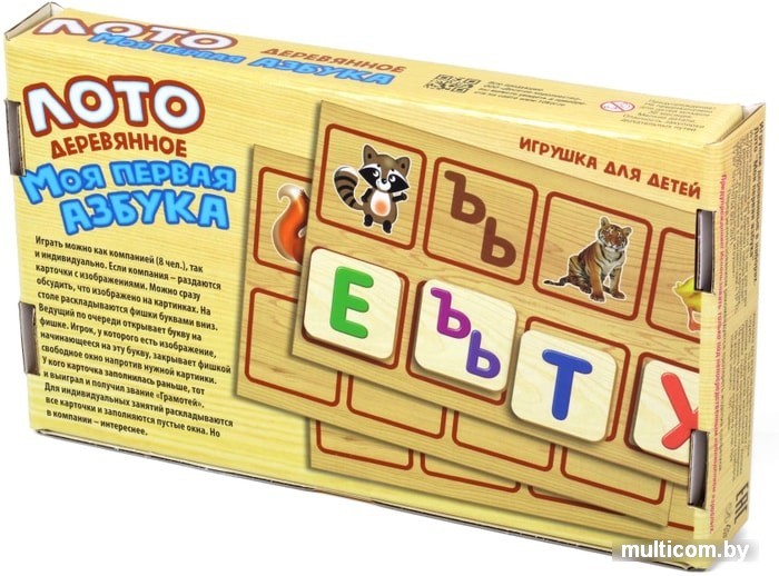 | Информация | В лото деревянное «Моя первая азбука» можно играть как компанией (8 человек), так и индивидуально.При игре компанией – раздаются карточки с изображениями. Можно сразу обсудить, что изображено на картинках. На столе раскладываются фишки буквами вниз. Ведущий по очереди открывает букву на фишке. Игрок, у которого есть изображение, начинающееся на эту букву, закрывает фишкой свободное окно напротив нужной картинки. Выигрывает тот, у кого карточка заполнилась раньше и получает звание «Грамотей».Для индивидуальных занятий раскладываются все карточки и заполняются пустые окна. Но в компании – интереснее и веселей. |