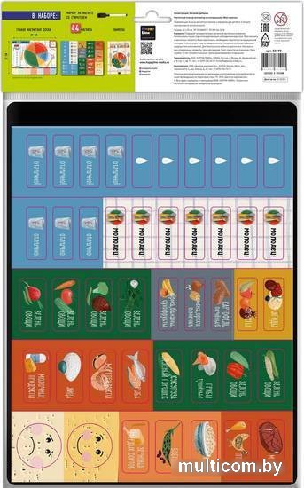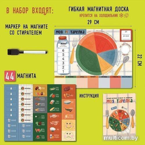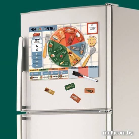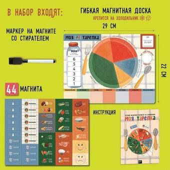| Информация | Правильное питание — залог здоровья. Приучайте вашего ребенка к сбалансированному питанию и выработке правильных привычек в еде с помощью красочного и удобного мотиватора на холодильник «Моя тарелка». Состав: - гибкая магнитная доска на холодильник (29?22 см) - магниты — 44 шт. (1.5?4 см ? 25 шт., 2?4 см — 17 шт., смайлики — 2 шт. диаметром 34 мм (грустный, веселый) - маркер на магните со стирателем - инструкция В набор входит доска с изображением тарелки с пятью группами продуктов, бутылки воды и днями недели, а также 44 магнита с разными продуктами, капельками для подсчета выпитой в течение дня воды и оценками на каждый день. Ежедневно заполняя поля волшебной тарелки, ваш ребенок будет питаться разнообразно и сбалансированно. В конце дня поставьте оценку с помощью магнита-оценки. Мотиватор наглядно и в игровой форме приучает к ответственному подходу к своему питанию и здоровью с малых лет, помогает разобраться в белках, жирах и углеводах и различных категориях продуктов. |