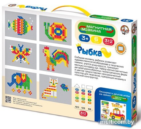 | Информация | Набор предоставляет неограниченный простор для творчества, превращая мозаику в плоский конструктор. Удобные схемы сборки представлены на обороте коробки. Собирая мозаику, ребенок развивает художественное воображение и творческие навыки, учится усидчивости, тренирует мелкую моторику рук. |