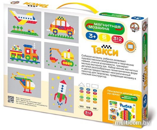 | Информация | Магнитная мозаика «Такси» - набор мягких магнитных деталей из 312 элементов, разнообразных геометрических форм (треугольники - 120 шт, квадрат - 126 шт, прямоугольники - 66 шт) и 6 цветов предоставляет неограниченный простор для творчества, превращая мозаику в плоский конструктор на магнитной доске. Удобные схемы сборки представлены на обороте коробки.Собирая мозаику, ребенок развивает художественное воображение и творческие навыки, учится усидчивости, тренирует мелкую моторику рук. |