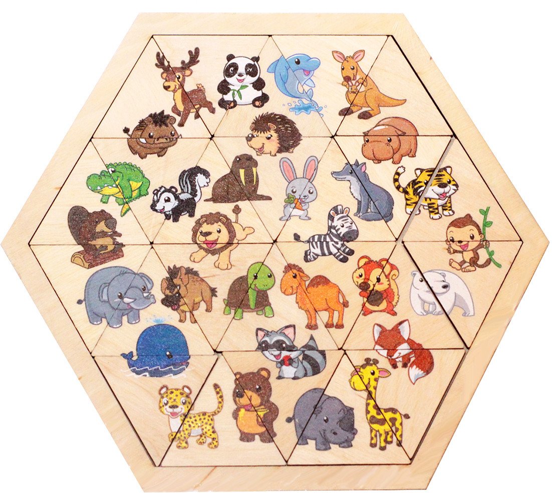 | Информация | - Изучение окружающего мира — одно из самых интересных и полезных занятий для малыша в первые годы его жизни. Животный мир особенно привлекает малышей, поэтому предлагаем изучить новых зверей с деревянным пазлом «Зверюшки. Занимательные треугольники». - Пазл представляет собой игровое поле с углублением, на котором предлагается расставить 24 треугольные фишки с картинками. На каждой фишке изображены части целых картинок — пазлы нужно расставить так, чтобы в результате все картинки оказались правильно собраны. Всего на собранном пазле получится 30 забавных зверьков: от полярного медведя до африканского носорога. - Все детали пазла изготовлены из берёзовой фанеры и тщательно отшлифованы, чтобы в процессе игры ребёнок не получил занозу и не поранился. - Игра с деревянным пазлом «Зверюшки» не только расширяет знания о животных планеты, но и стимулирует развитие мелкой моторики рук, логики и усидчивости. - Комплектация: шестигранное игровое поле (от угла до угла по горизонтали — 22,5 см, по вертикали между параллельными сторонами — 19.5 см); треугольные фишки — 24 шт. (размер — 5?5?5 см). |