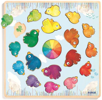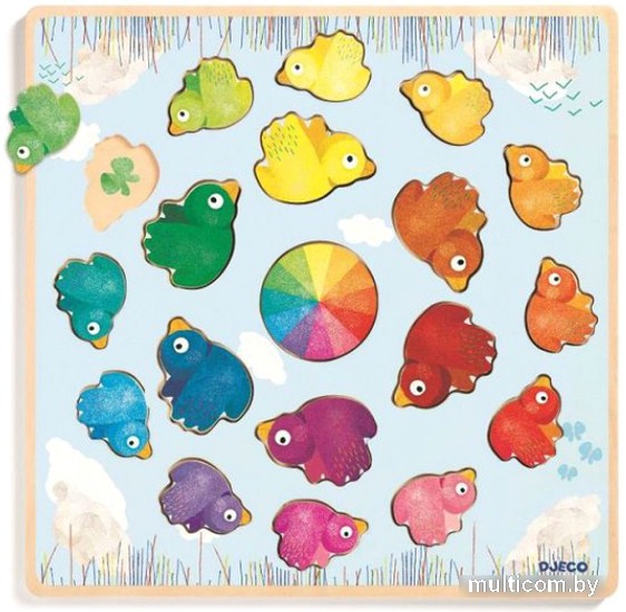 | Информация | «Радуга» - это еще один уникальный шедевр от компании Djeco. В комплект входит деревянная основа светло-голубого цвета и множество деревянных птичек разных цветов и оттенков. На указанной основе имеются отверстия, в которые малыш должен поместить птичек. Для того чтобы сориентироваться и расположить всех пернатых героев правильно, малыши могут воспользоваться подсказкой – радугой, которая расположена прямо в центре доски. Такая игра превосходно развивает понимание детьми различных форм, цветов и оттенков, тренирует их сообразительность, усидчивость и внимательность. |