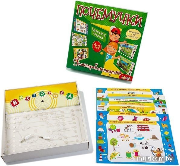 | Информация | Электровикторина для детей 4-5 лет, в которой собраны все самые увлекательные и полезные задания для вашего ребенка. Карточки составлены в соответствии с возрастом и программами дошкольного образования, и могут быть использованы как дома, так и в детском саду. Вторая игра из комплекта для дошкольников: 1. «Непоседы» (3-4 года) 2. «Почемучки» (4-5 лет) 3. «Звездочки» (5-6 лет) 4. «Умнички» (6-7 лет) Все игры могут быть использованы независимо друг от друга, задания не повторяются. В игре 10 двусторонних карточек, 20 заданий. На каждой карточке – 8-12 пар изображений (всего 204 «вопроса» в игре). Игроки выбирают одну из карточек, кладут ее в коробку поверх электронной платы и читают задание-вопрос. Затем с помощью двух проводков-электродов выбирают на карточке парные изображения – прикладывают электроды к отверстиям рядом с картинками. Если ответ правильный, загорается лампочка и звучит музыка. Задания карточек: 1. Найди предметы одного цвета 2. Какой формы предметы? 3. Найди предметы в городе 4. Кому какой покров принадлежит? 5. Найди сходство и отличия 6. Найди недостающие части 7. Найди мячики одинакового размера 8. Где чья игрушка? 9. Что сначала, что потом? 10. Найди одинаковое количество предметов 11. Какие предметы подходят друг другу? 12. Где чей хвост? 13. Где чей транспорт? 14. Что где растет? 15. Кто где живет? 16. Найди предметы со схожим назначением 17. Узнай сказки 18. Названия каких предметов начинаются одинаково? 19. Найди предметы, названия которых начинаются на одну букву? 20. Узнай животных по древним наскальным рисункам. Обучающие интерактивные игры – то, что нужно маленьким почемучкам! В комплекте: 10 двусторонних карточек, плата, светозвуковой модуль, батарейки, правила. Возраст: 4—5 лет. |