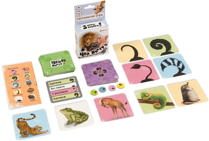 | Информация | Поросёнок и хамелеон – что у них общего? А у льва и тушканчика? Сразу и не догадаться... У них очень похожие хвостики: у поросёнка и хамелеона они загибаются крючком, у льва и тушканчика хвосты с кисточкой.Запоминайте карточки с животными, ищите совпадения по типам хвостов, выполняйте задания – и победа достанется именно вам!В игре 3 варианта правил: для самых маленьких игроков, для детей постарше и для совместной игры в команде. |