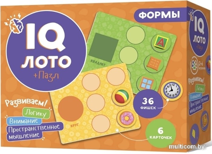 | Информация | Количество игроков: 2-4 чел. IQ лото «Формы» направлено на развитие логики, внимания и наблюдательности. Это простое обучение формам через развлечение. Лото научит обобщать и анализировать, а дополнительная игра на логику — пазл — закрепит полученные навыки. |