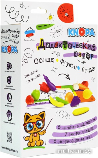 | Комплектация | Набор представлен 13 игрушками на подложке: Лимон, перец, клубника, апельсин, банан, виноград, кабачок, помидор, огурец, морковь, банан, яблоко, чеснок. |