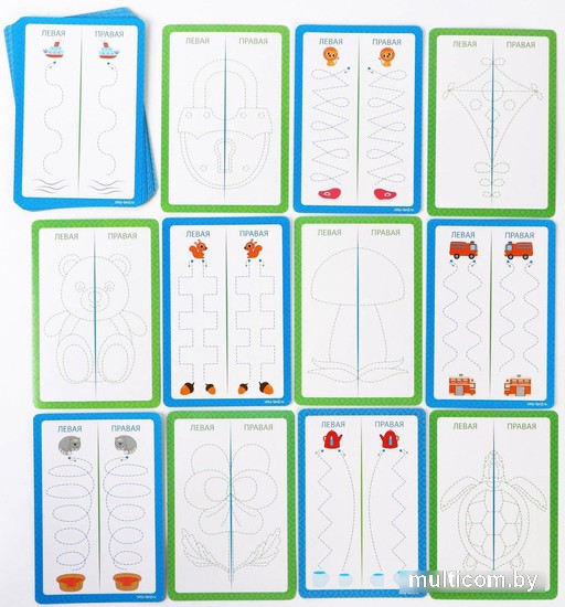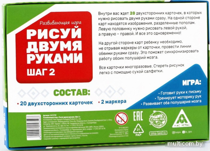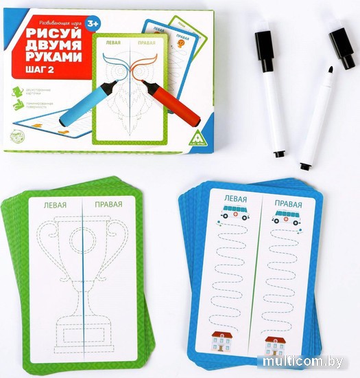 | Информация | Внутри игры от Лас Играс вас ждёт 20 двухсторонних карточек, на которых нужно рисовать обеими руками одновременно. На одной стороне карт находятся изображения, разделённые пополам. ? Левую половинку нужно рисовать левой рукой, а правую — правой. ? На другой стороне карт ребёнку необходимо провести линии обеими руками, не отрывая маркеры от карточки. Это поможет синхронизировать работу обоих полушарий мозга. ?? Все карточки многоразовые, легко стираются с помощью сухой салфетки или обратной стороны маркера. |