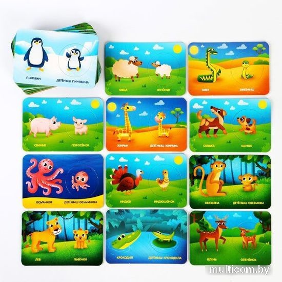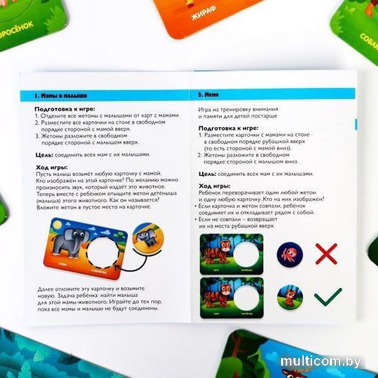 | Информация | Благодаря этой игре ребенок узнает, как называют детенышей разных животных. А еще сможет потренировать моторику рук, вставляя жетоны с детенышами в нужные карточки. Как играть? Пусть малыш возьмет любую карточку с мамой животного и ответит на вопрос: «Кто изображен на этой карточке?». Можно произносить звук, который издает этот зверь. Теперь вместе с ребенком отыщите жетон детеныша (малыша) этого животного. Как он называется? Вложите жетон в пустое место на карточке. Другой вариант: используйте карточки и жетоны для игры в «Мемо». Просто разложите их рубашкой вверх, а затем отыщите как можно больше парочек. Парой в этом случае является детеныш и его мама. Например, кошка и котенок. Внутри вы найдете: 30 карточек с мамами. 30 жетонов с малышами. Правила игры. |