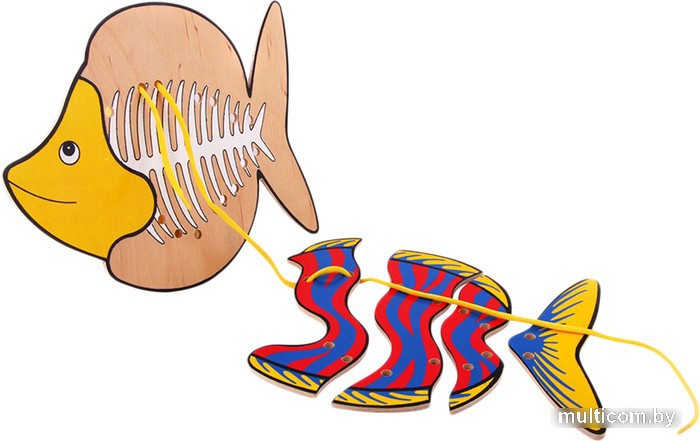 | Информация | Пришнуровывая детали рыбки к основе, называйте их малышу: голова, плавник, хвост. Расскажите, где живет рыбка, чем питается. Предложите малышу обвести рыбку-основу и разукрасить ее по-своему. Со временем у вас может появиться самый настоящий аквариум с фантастическими рыбками. |