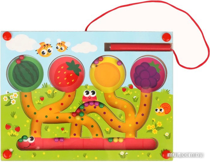 | Информация | Магнитный лабиринт «Ягодки» -- очень интересная игрушка, которая завладеет вниманием ребёнка на долгое время! Игра способствует не только увлекательному досугу, но и развитию мелкой моторики, внимания и координацию движений, а также способности классифицировать предмету по цвету. На красочном игровом поле есть 4 ячейки с изображениями ягод и фруктов (арбуза, клубники, лимона и винограда), извилистый лабиринт, шарики 4-х различных цветов и магнитная палочка, которая крепится к игрушке на верёвочке. Задача ребёнка -- при помощи магнитной палочки провести каждый шарик по дорожкам лабиринта именно в ту ячейку, которая соответствует ему по цвету! |