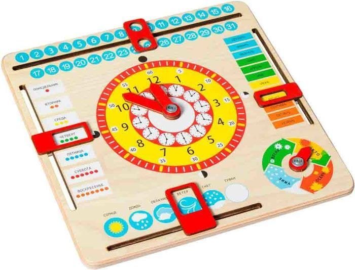 | Информация | - представляет собой деревянную основу, на которой в центре расположены циферблат, часовая и минутная стрелки, которые можно передвинуть. - со всех четырех сторон панели есть специальные передвигающиеся ячейки, которые можно выставлять в зависимости от месяца, даты, дня недели и погоды. - на панели есть изображение поры года со стрелкой.Эта развивающая игрушка станет увлекательным занятием для малыша в возрасте от 3 лет . Поможет ребенку увлекательно изучить дни недели, месяца, даты, время, пору года. А необычайный яркий дизайн сделает процесс обучения еще более интересным! Также игрушку можно использовать как ежедневный календарь. |