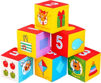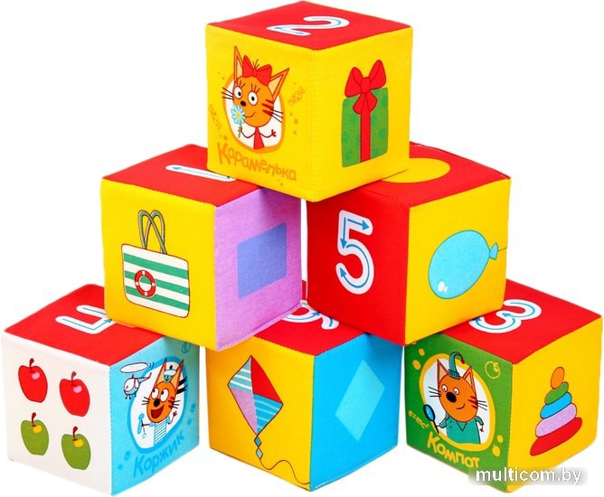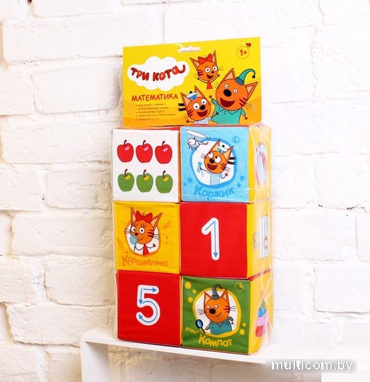 | Информация | Набор из шести мягких кубиков «Математика Три Кота» размером 10 см. Изучаем цифры и учимся считать от 1 до 6. Учим формы и сравниваем, на какую форму похожи предметы. Узнаваемые герои из мультфильма «Три Кота» Коржик, Компот и Карамелька очень любознательны и дружелюбны. |