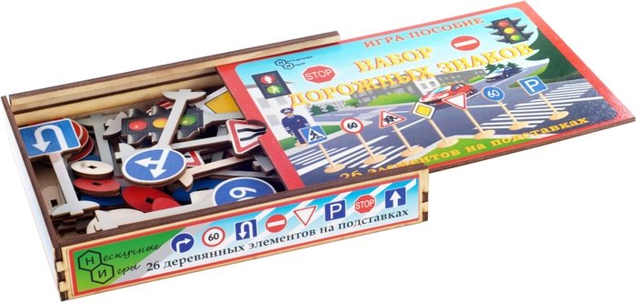 | Информация | Настоящая игра-пособие поможет Вашему ребенку запомнить значения самых распространенных знаков дорожного движения, научиться правильно исполнять их требования.С помощью деревянных дорожных знаков на подставках Вы сможете моделировать реальные дорожные ситуации на полу и на столе с участием игрушечных машинок и пешеходов.Желаем веселых игр! |