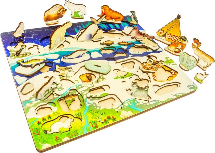 | Информация | Деревянная доска "Под Большой Медведицей" - это игровая панель для развития мелкой моторики, внимания, усидчивости и воображения Вашего малыша. С ее помощью в увлекательной игровой форме ребенок познакомится с природой Заполярья и его обитателями, узнает, как выглядит северное сияние и созвездие Большой Медведицы, как живут северные народы.Вместе внимательно рассмотрите игровое поле, спросите ребенка, каких животных он видит (белый медведь, морж, тюлень, полярная сова, кайран, тупик, сапсан, овцебык, песец, волк, олень, лайка), попросите посмотреть, кто спрятался за камнями, в воде, в снегу и за льдинами (горностай, лемминг, заяц, нарвал, белек, палтус, треска).Достаньте животных из ячеек и расставьте их на подставки. Предложите ребенку показать Вам всех птиц, всех рыб, всех хищных животных, всех травоядных. Обсудите особенности разных животных. Кто из них умеет плавать, а кто нет? У кого есть рога? У кого бивни? Чем они питаются? Посмотрите, какие растения можно встретить в тундре (карликовая береза, ягель, брусника, морошка). Обратите внимание на изображения, высеченные на одном из камней. Это петроглифы - древние наскальные рисунки. Они считаются частичками культуры первобытных племен. |