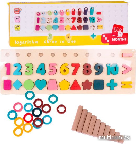 | Комплектация | Планшет-основа с колышками, 10 цифр, 4 арифметических знака, 9 разных фигур, 10 колышек для нанизывания колечек, 55 пластиковых колечек |
