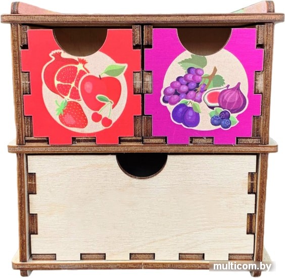 | Комплектация | Один «комодик» с ящиками и прорезями для опускания фигурок фруктов и ягод, один большой ящик – для хранения рамок – вкладышей с фигурками фруктов и ягод, четыре маленьких ящика, окрашенных в разные цвета: зеленый, желтый, красный, фиолетовый – для сортировки фигурок фруктов и ягод по цветам. Рамки – вкладыши представляют собой деревянные дощечки с выемками для фигур фруктов и ягод в количестве 3 шт. |