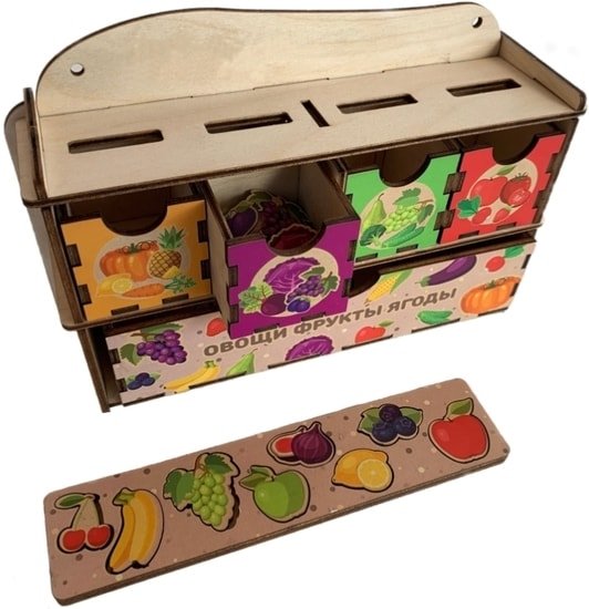 | Комплектация | один «комодик» с ящиками и прорезями для опускания фигурок фруктов, ягод, овощей, один большой ящик – для хранения рамок – вкладышей с фигурками фруктов, ягод, овощей, четыре маленьких ящика, окрашенных в разные цвета: зеленый, желтый и оранжевый (один ящичек для двух цветов), красный, фиолетовый – для сортировки фигурок фруктов, ягод и овощей по цветам. Рамки – вкладыши представляют собой деревянные дощечки с выемками для фигур в количестве 4 шт |