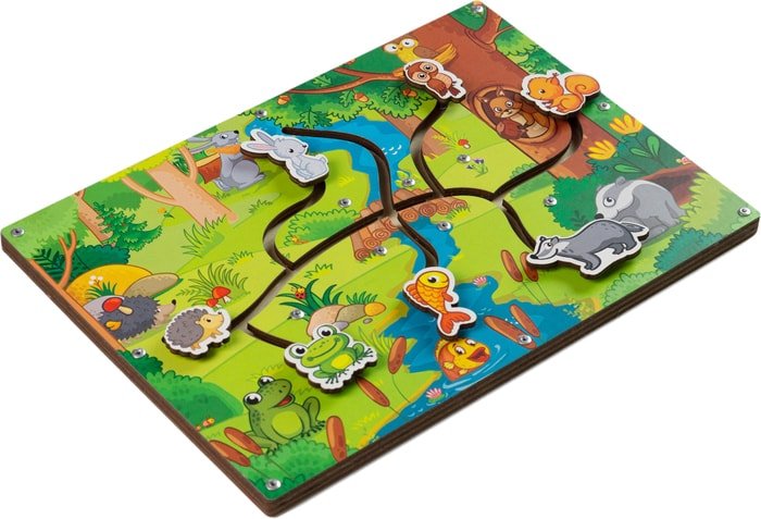 | Информация | Сортер «Лабиринт-пара Лес» представляет собой деревянную панель с изображением леса и его обитателей: ежа, лягушки, зайчика, совы, белки, рыбки в лесном пруду, бурундука. На штангах изображены – детеныши животных. Прорези - дорожки для их передвижения. Развитие мелкой моторики и координации движений. Перемещая штанги по лабиринту, ребенок прекрасно осваивает эти задачи. Понятия об окружающем мире. В процессе игры с сортером – лабиринтом ребенок запоминает названия лесных животных и их повадки. Развитие логического мышления. Ребенок, играя с сортировщиком, развивает свое логическое мышление, благодаря поиску и классификации животных. Развитие внимания, умения сосредотачиваться на процессе.Для начала расскажите о животных леса. Какие они бывают. Об их повадках. Предложите малышу отправить каждого детеныша к его маме или папе.В какие игры еще можно поиграть с данной игрушкой: организуйте сюжетные игры. Придумайте рассказ о животных леса. Нарисуйте на картоне и разукрасьте, например, всю семью ежей. Вырежьте ножницами. Разложите по величине. Папа – самый большой, мама – чуть поменьше, а малыш – самый маленький ежик. |