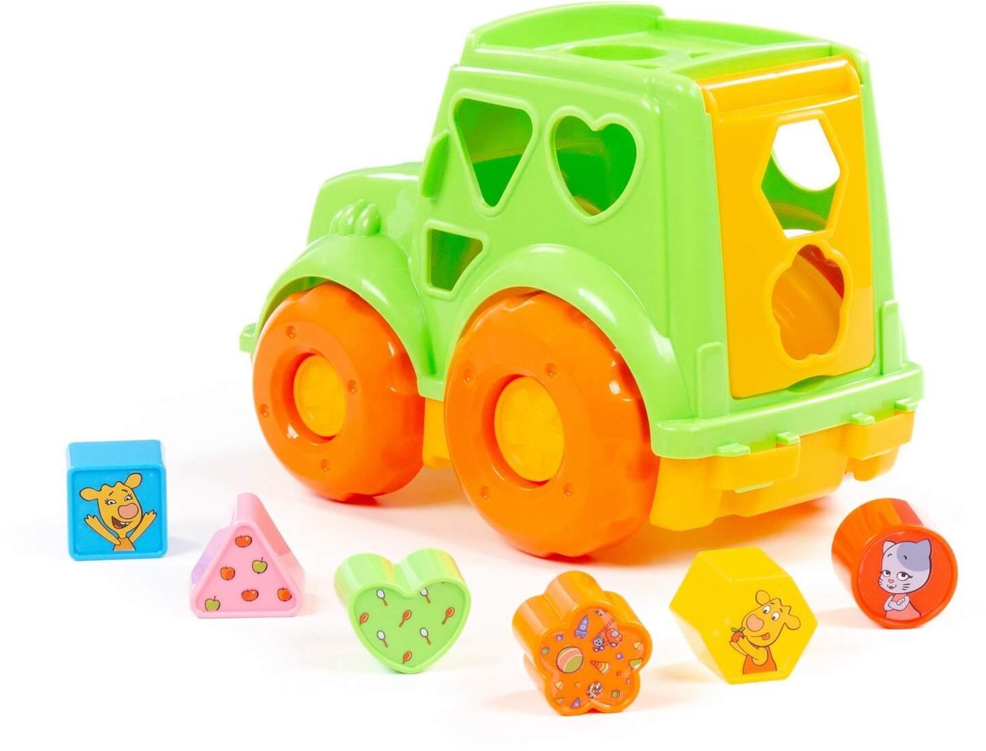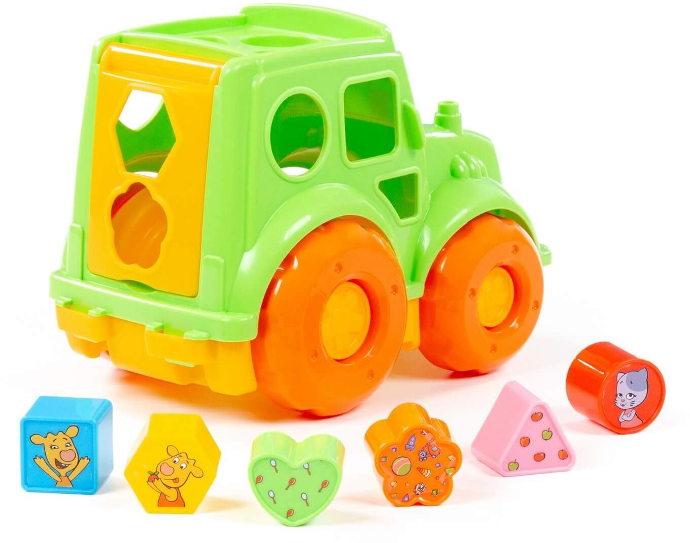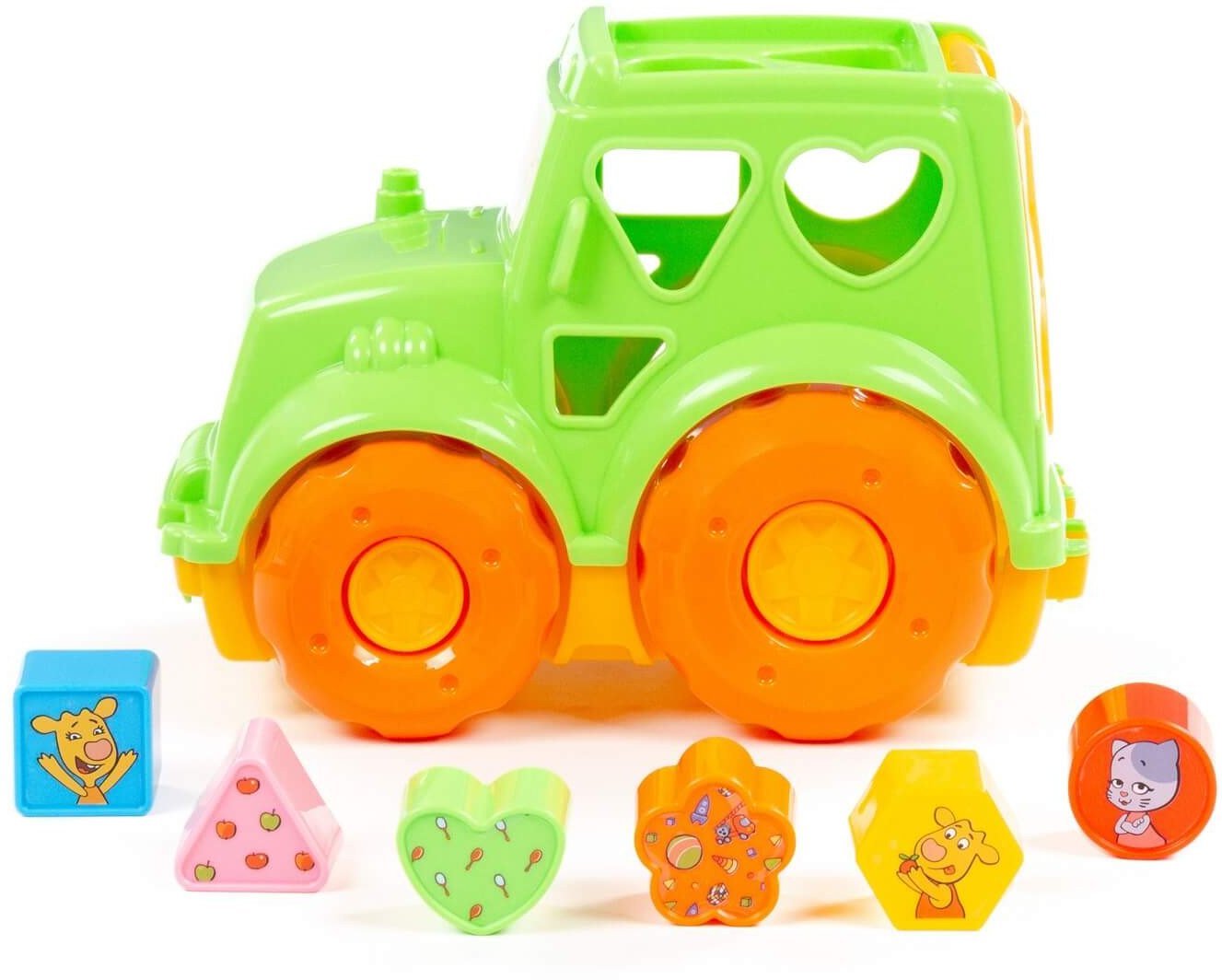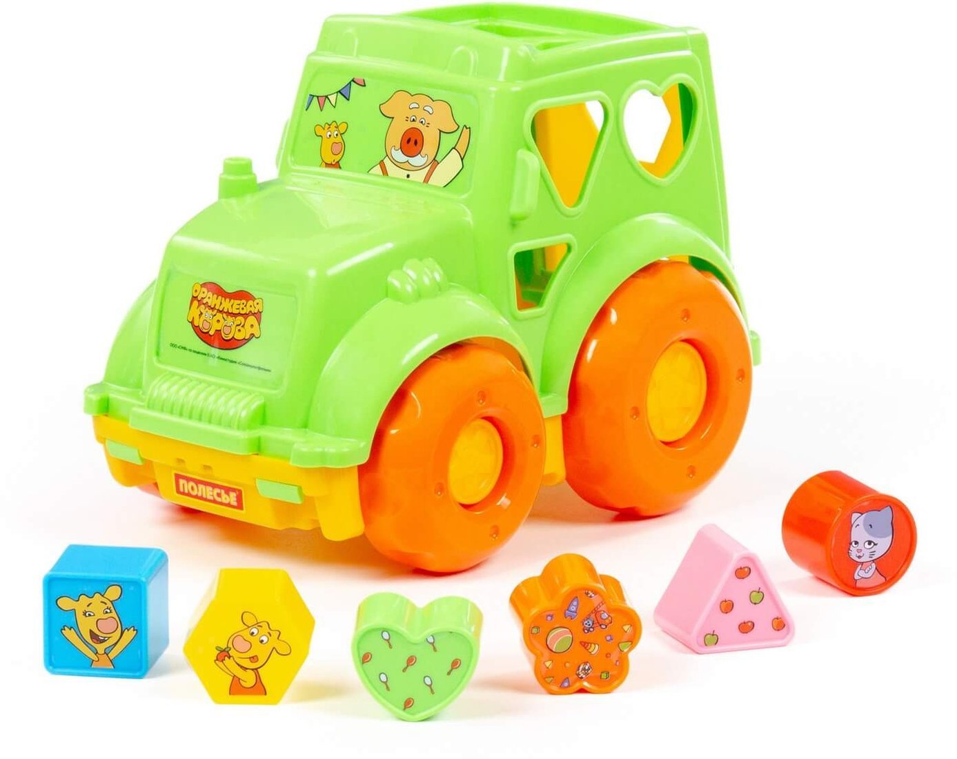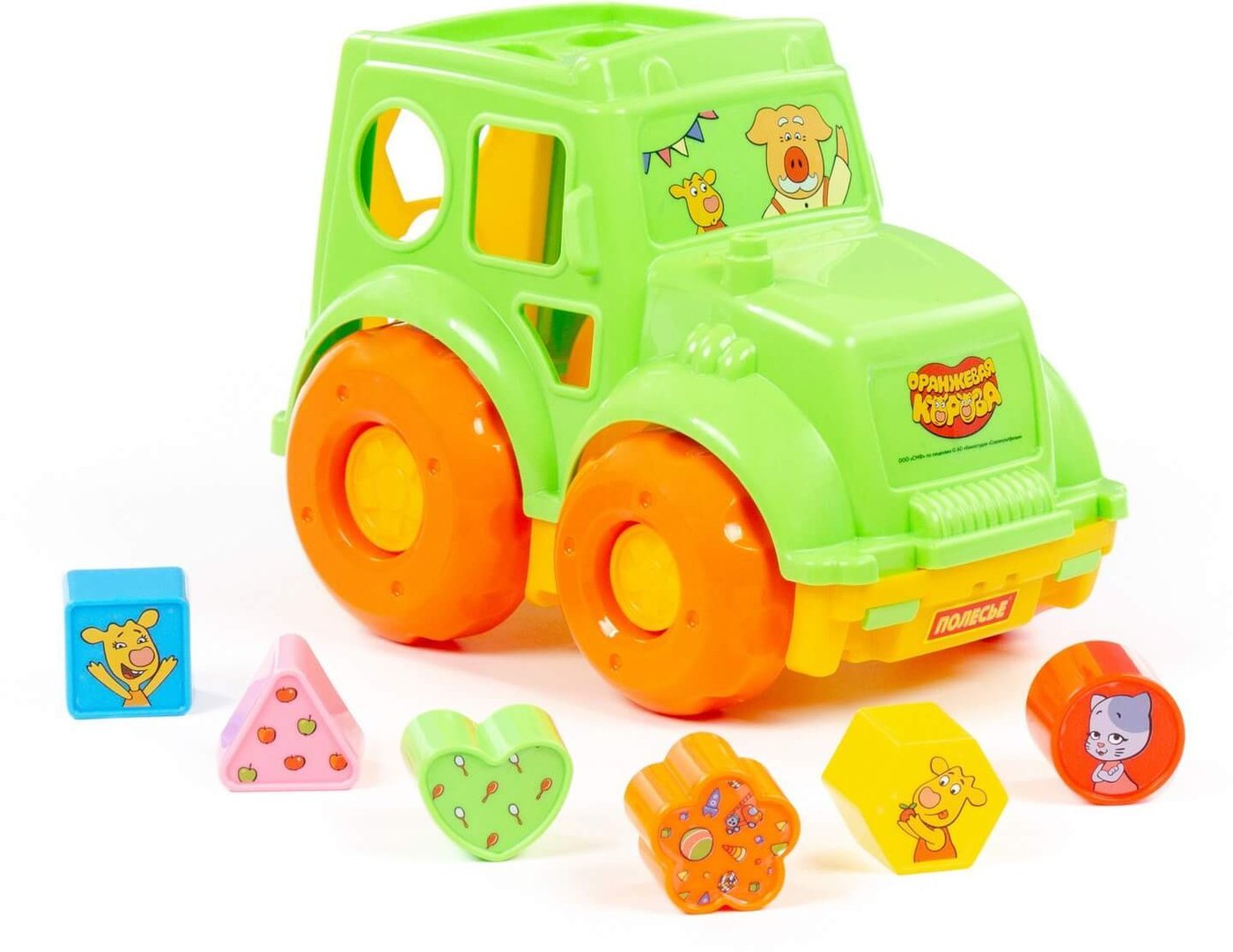 | Информация | - Любимые герои из мультсериала «Оранжевая корова» придают позитивный настрой детским играм. - Трактор «Оранжевая корова» — это развивающая игрушка для малышей от 1 года. Кузов трактора оснащен крышкой с отверстиями различных форм, куда нужно вставлять подходящие фигурки. - В набор входят 6 фигур: круг, квадрат, треугольник, многоугольник, цветочек и сердечко. - Чтобы вернуть фигурки обратно, достаточно открыть крышку кузова. Надежные колеса обеспечивают отличную проходимость на разных поверхностях. Игрушка упакована в яркую коробку. - |
