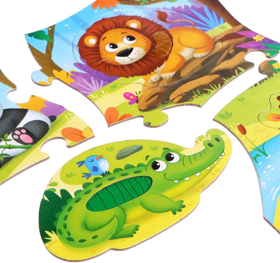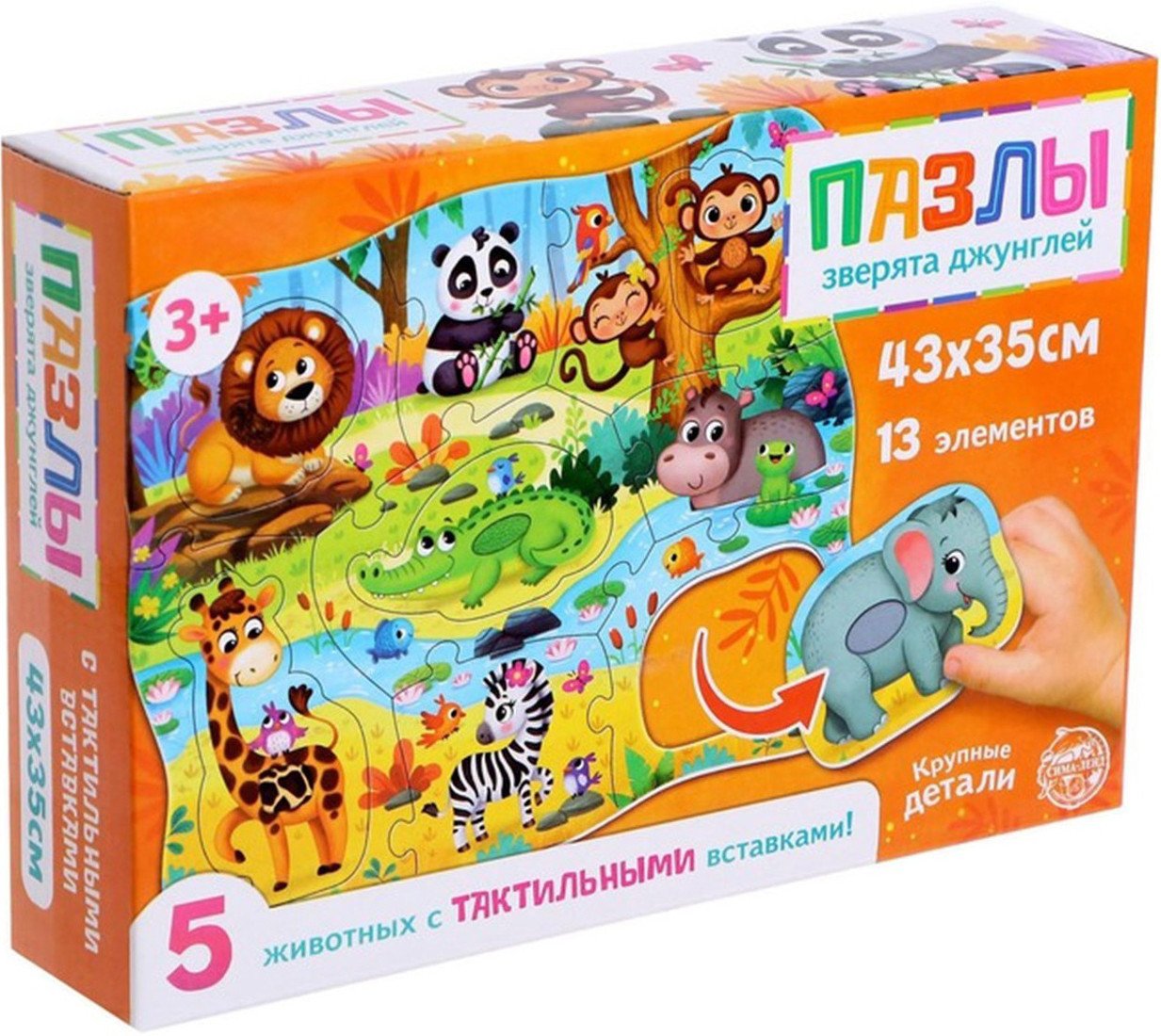 | Информация | - Puzzle Time Зверята джунглей 4674428 - это развивающая игра с тактильными вставками, состоящая из 13 деталей. - Ребенок сможет собрать 5 разных пазлов и познакомиться с животными джунглей. - Игра поможет развить усидчивость, координацию и мелкую моторику рук, а также научит находить связь между частью и целым. - Яркие картинки поднимут настроение и привлекут внимание малыша, а также поспособствуют развитию цветового и зрительного восприятия, внимательности и логического мышления. |