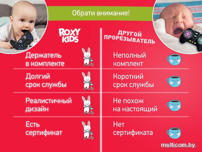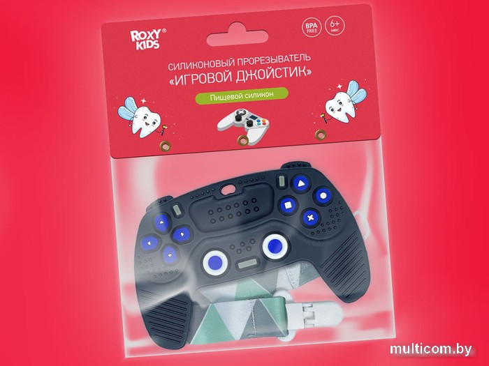 | Информация | ? Яркая и интересная игрушка от Roxy-Kids - прорезыватель в виде игрового джойстика, который поможет снизить дискомфорт во время прорезывания зубов у вашего малыша! ? Силиконовый джойстик выглядит как настоящий и имеет интерактивные кнопки для увлекательной игры. ? Рельефная поверхность массирует десны и зубки малыша, облегчая боль и зуд при появлении первых зубов. ? Помогает развить моторику рук, координацию движений, а также восприятие цвета и формы. ? Оснащен специальным отверстием для держателя и формой для приготовления льда с обратной стороны. ? Изготовлен из гипоаллергенного пищевого силикона и подходит для ежедневного использования. ?? Держатель с надежной запатентованной клипсой, чтобы прорезыватель не упал и не потерялся. ? Держатель выполнен из двух слоев полиэстера, прочно сшитых вместе, поэтому он не износится и не порвется. ? Размер держателя: 18.5?2.5 см. |
