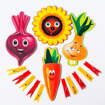 | Информация | Игра с прищепками «Веселый огород» изготовлена из дерева – экологически чистого и гипоаллергенного материала. В комплект входит: Коробка с крышкой, фигурки овощей (3 шт.), подсолнуха (1шт.), прищепки (24шт.). Игра развивает: навыки сложения и вычитания, речь, мелкую моторику, цветовое восприятие, фантазию, воображение, память, внимание. Как играть? Покажите ребенку, как пользоваться прищепкой. Объясните, какие пальчики нужно сжимать, чтобы прищепка раскрылась. Объясните малышу технику безопасности: если прищемить пальчик, то может быть больно. 1. Развитие мелкой моторики. Предложите ребенку по выбору украсить свеклу, лук, морковь или подсолнух. Пусть малыш сам решит, какие цвета прищепок он хочет выбрать. Предложите ребенку перенести прищепки на другой объект. Закрепите прищепки поверх других, придумывая растениям новые образы. Для развития координации рук предложите ребенку закрыть глаза и снять все прищепки наощупь не глядя. 2. Изучение цвета (красный, синий, белый, желтый). Закрепите на растении прищепки одного цвета, на другом растении – другого цвета. Расскажите ребенку, как называются эти цвета. На третьем растении закрепите эти оба цвета. Указывайте ребенку на прищепку, называя цвет. Попросите ребенка самого назвать цвет прищепки, на который вы указываете. Изучите по такому же принципу другую пару цветов. Смешайте все изученные цвета и называйте их все. 3. Тренировка счета. Если малыш только учится считать (от 3 лет), просто считайте прищепки разных цветов на растениях. Для детей постарше. Закрепите на растении прищепки одного цвета. Посчитайте их. Добавьте прищепки другого цвета. Сколько будет всего прищепок обоих цветов? Пересчитайте прищепки по одной, проверяя правильность осуществленного сложения. Повторите те же действия для вычитания, убирая прищепки. Тренируйте навыки сложения и вычитания с двумя-четырьмя цветами. Если ребенок уже умеет писать, то запишите, как будет выглядеть этот пример на бумаге. Пример задания для ребенка, умеющего считать. На подсолнухе сидело 4 синих бабочки, 3 красных и 1белая. 2 синих бабочки и 1 красная перелетели на морковку. Сколько бабочек каждого цвета осталось на подсолнухе? Сколько всего бабочек стало на морковке? 4. Тренировка внимания и памяти. Прицепите некоторое количество прищепок разного цвета. Пусть ребенок посмотрит и запомнит, как расположены прищепки разных цветов. Попросите его закрыть глаза. В это время поменяйте местами прищепки, уберите или добавьте новые. Когда ребенок откроет глаза, пусть попробует вспомнить, что изменилось в расположении прищепок и вернет первоначальный вариант. Чтобы было легче себя проверить, фотографируйте или записывайте исходный вариант. Начинайте с самого простого одноцветного варианта игры с малым количеством прищепок. Постепенно усложняйте, добавляя цвета и размещая прищепки на нескольких растениях. Очень хорошо, если такое же задание даст вам ваш ребенок, и проверит вашу память и внимание. Сможет ли взрослый выполнить такое задание без ошибок? Попробуйте иногда специально ошибаться, чтобы ребенок смог обнаружить ошибку. В таком случае тренируется еще и внимательность ребенка. 5. Развитие воображения. Придумайте вместе с ребенком историю про героев игры. Они могут дружить, ссориться и даже драться. Может быть, это будет история из 