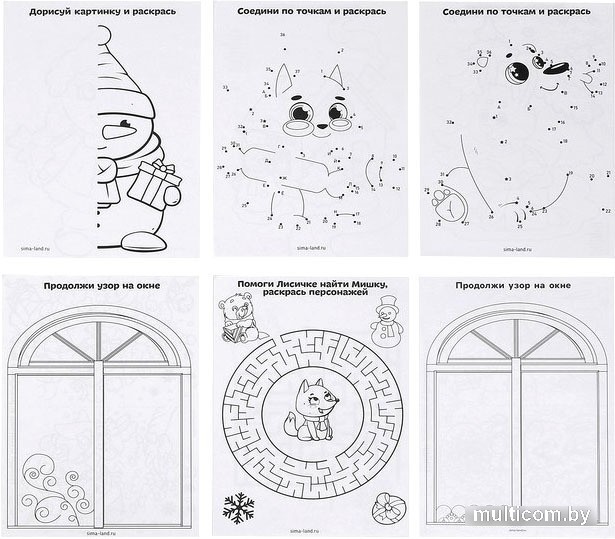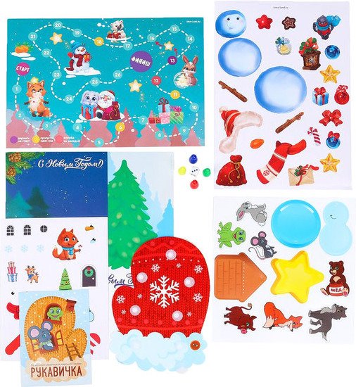 | Комплектация | игра-бродилка; кубик и фишки; сказка "Рукавичка"; 12 творческих заданий; 4 ёлочные игрушки с наклейками; 2 открытки с наклейками; наклейки; липучки. |