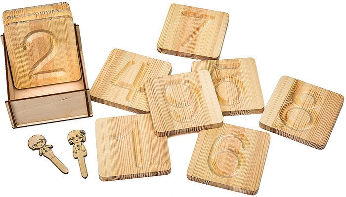 | Информация | Размер модуля: 10 см*10 см Материал: массив сосны, фанера Игра для закрепления зрительного образа цифры, развития графомоторных навыков, двигательной памяти. Как играть? 1. Рассмотрите все дощечки вместе с ребенком, назовите, какие цифры на них изображены. 2. Выберите дощечку с цифрой 1, покажите ребенку, как можно обвести цифру пальчиком (помните, что направление движения должно быть сверху вниз). Попросите ребенка повторить ваше движение. Подобным образом обведите цифры на других дощечках. 3. Предложите ребенку выложить контур цифры на дощечке с помощью мелкой крупы, бисера, термомозаики, пластилина и т.п. 4. Используйте дощечки с цифрами для игр со счетным материалом. Например, выберите цифру 5 и попросите ребенка выложить столько же карандашей (счетных палочек, фишек, пуговиц, игрушек и т.п.). |