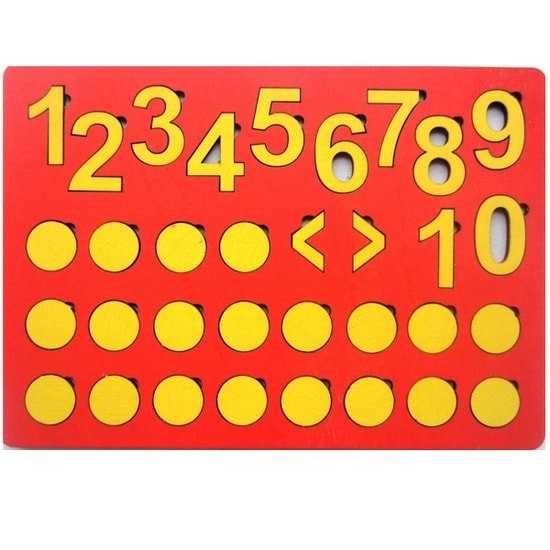 | Информация | Деревянный планшет красного цвета размером 21*15 см с 33 желтыми выемками: 11 цифр, 20 кружков, 2 знака (больше-меньше). Цвет выбран неслучайно: ничто не должно отвлекать ребенка от главной цели игры - считать кружки и подбирать нужную цифру. Можно выкладывать цифры по возрастанию - от 1 до 10 и изучать двузначные числа - от 10 до 99. "Кружки и цифры" направлены на развитие у детей мышления, познавательных способностей, мелкой моторики, формирование элементарных математических представлений. Ваш ребенок в увлекательной форме изучит цифры и счет. |