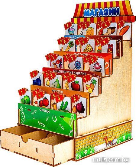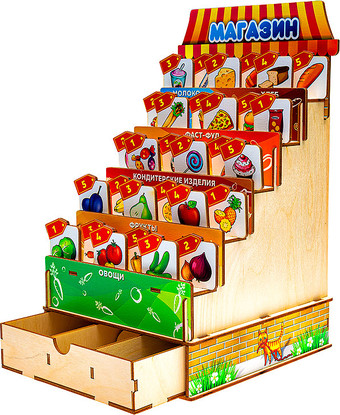 | Информация | Материал: фанера, бумага Размер: 30*20*5 см 1. Игра «Мой магазин». Вместе с ребенком соберите полки, рассмотрите вывески для разных отделов, назовите, какие продукты продаются в магазине. Объясните, что такое касса, ценник, зачем нужны деньги. Спросите, как называется магазин, в котором продаются продукты? Обсудите, какие еще бывают магазины. 2. Игра «Список покупок». Назовите ребенку 3-5 продуктов, которые вы хотите купить в магазине. Попросите запомнить их названия и выбрать продукты по вашему «списку». 3. Игра «Что купить?». Попросите ребенка разложить монеты по ячейкам кассы в соответствии с номиналом (1, 2, 5, 10 рублей). Возьмите 2 рубля, предложите выбрать в магазине продукты такой же стоимости. Обратите внимание, что за одну монету можно купить несколько продуктов. Сколько продуктов можно купить за 5, 10 рублей? 4. Игра «Полезные ? вредные». Предложите ребенку выбрать свой самый любимый (нелюбимый) продукт, попросите объяснить свой выбор. Обсудите, какие продукты полезны (вредны) для здоровья человека. |