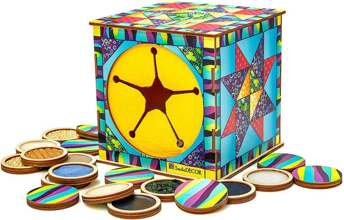 | Информация | Материал: фанера, текстиль Размер: 13 см*13 см*13 см Диаметр фишки: 4,2 см Игра для развития тактильных ощущений, сенсорного опыта, внимания, памяти, мышления, воображения, мелкой моторики, речи. Как играть? 1. Игра «Найди парочку». Разложите на столе 10 фишек, по одной фишке из каждой пары. Оставшиеся 10 фишек спрячьте в куб. Выберите одну из фишек на столе и попросите ребенка найти такую же фишку на ощупь в кубе. Поменяйтесь с ребенком ролями. 2. Игра «Третий лишний». Попросите ребенка закрыть глаза и разложите на столе 3 фишки, две из которых одинаковые. Задача ребенка – определить на ощупь лишнюю фишку, не парную. 3. Игра «Ассоц+I9:K9иации». Спрячьте все фишки в куб и предложите ребенку найти на ощупь фишки с мягкой, твердой, гладкой, колючей, волнистой, зеленой, белой, красной поверхностью. Предложите придумать названия для каждой фишки («Травка», «Море», «Снег» и т.д.). Еще больше игр в инструкции! |