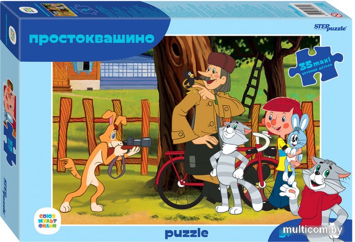 | Информация | Пазл «Простоквашино» состоит из 35 крупных деталей. Его картинка дублирует известную сцену из мультфильма: ту самую, где Шарик фотоохотой занимается. |